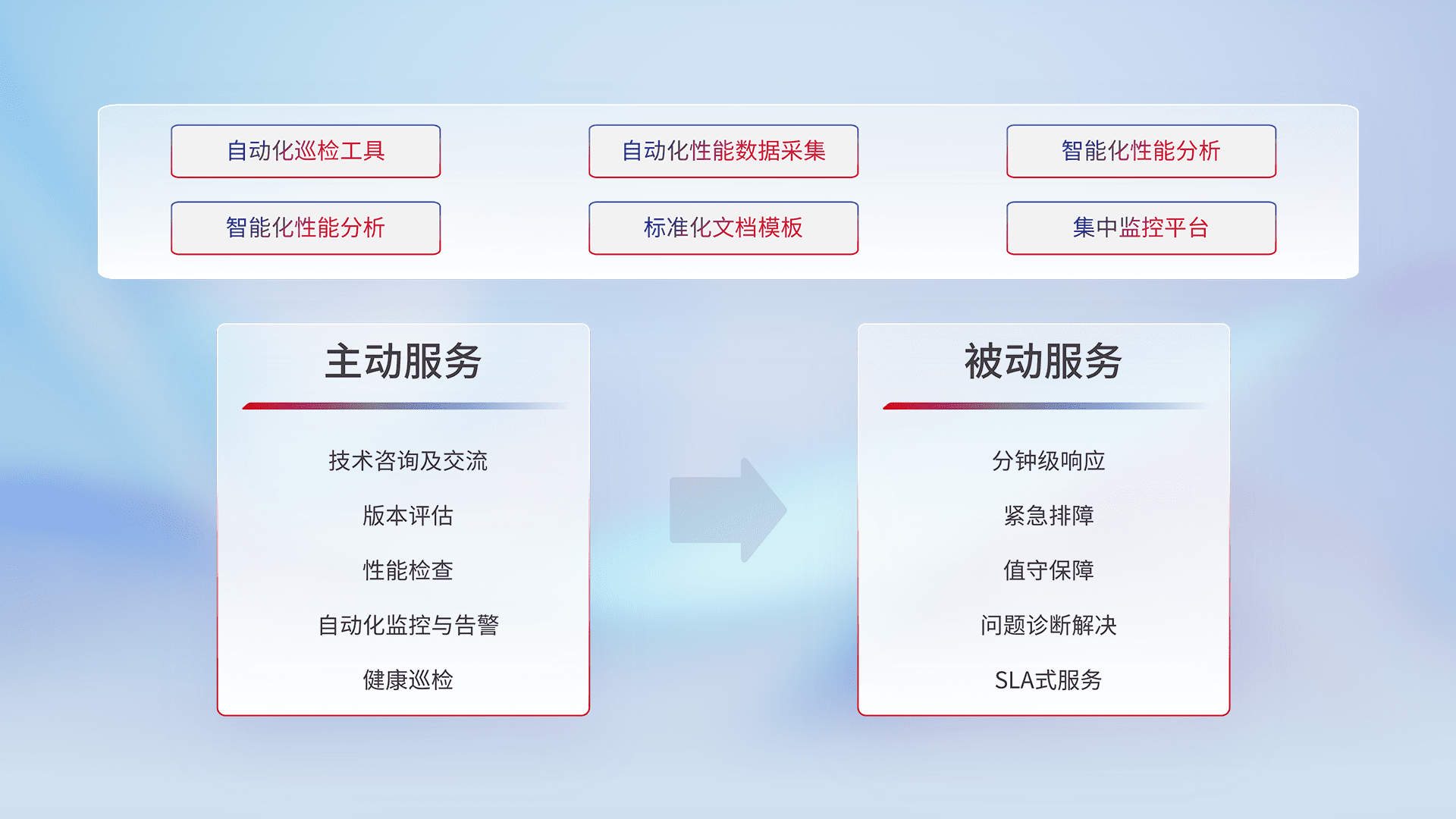 智能化工具和标准化文档,,保障服务质量,,,提供主动服务(包含技术咨询、、版本评估、、性能检查、、自动化监控与告警、、、健康巡检)和被动服务包含(分钟级响应、、紧急排障、、、、值守保障、、、、问题诊断解决、、、SLA服务)。。