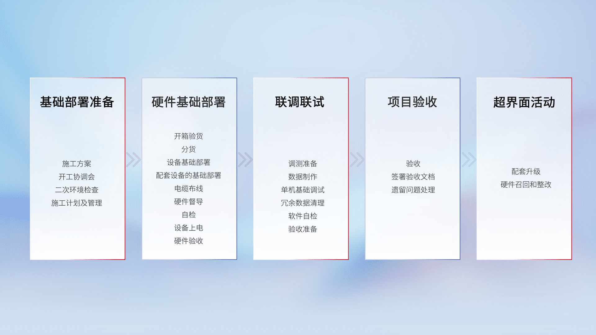 从基础部署准备、、、硬件基础部署、、、联调联试、、项目验收、、越界面活动的全过程可追溯,,,,保证施工质量和进度。。